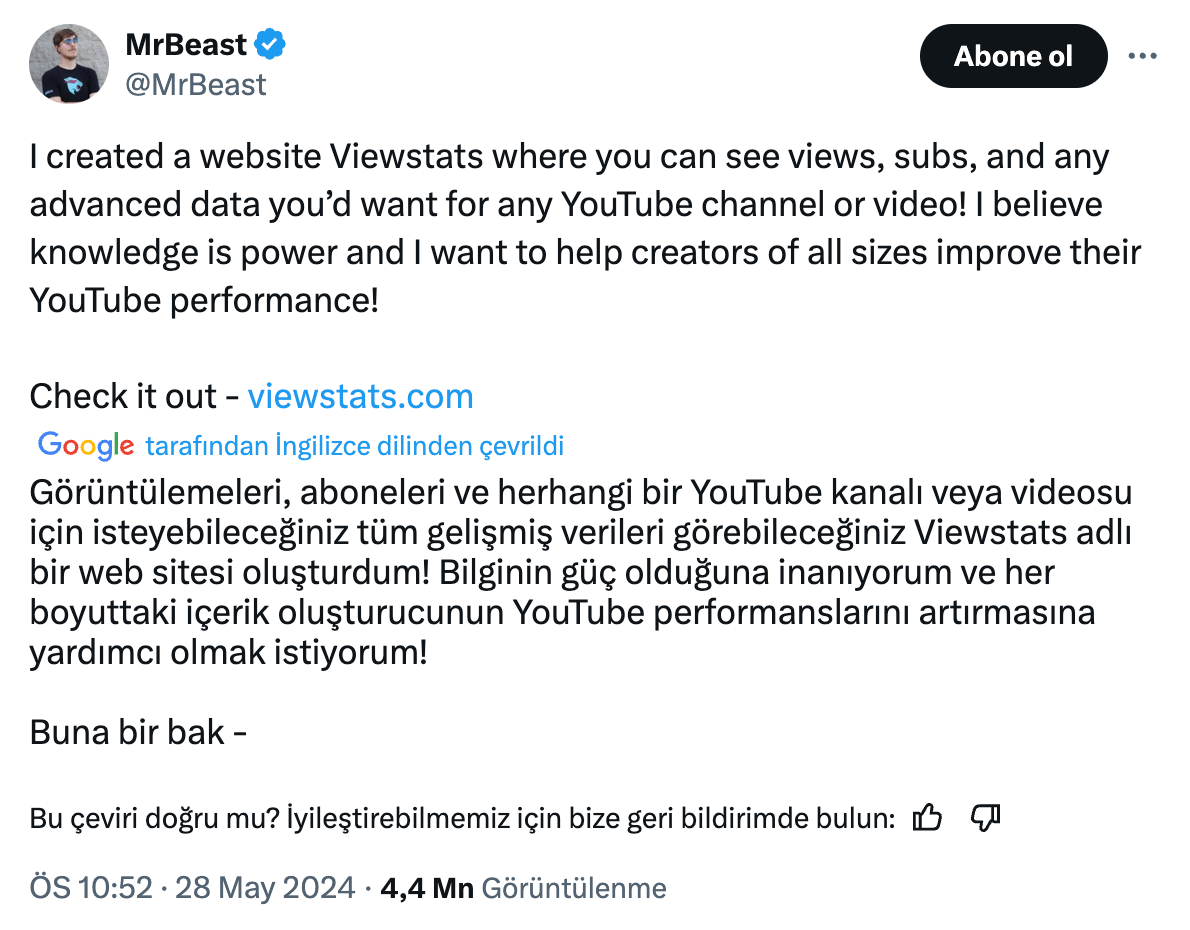 Mr.Beast yayınladığı bir X gönderisi ile youtube kanallarının istatistiklerinin görülebildiği bir sayfa hazırladığını duyurdu.